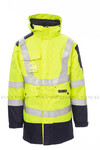 Two-tone, high-visibility all-purpose parka, with 8 mm plastic zip and metal cursor with Velcro flap, detachable, fitted, ergonomic hood with drawstring, stretch adjustable cuffs, roomy front pockets with flap and button, two with zip, foldaway/detachable badge holder. Padded